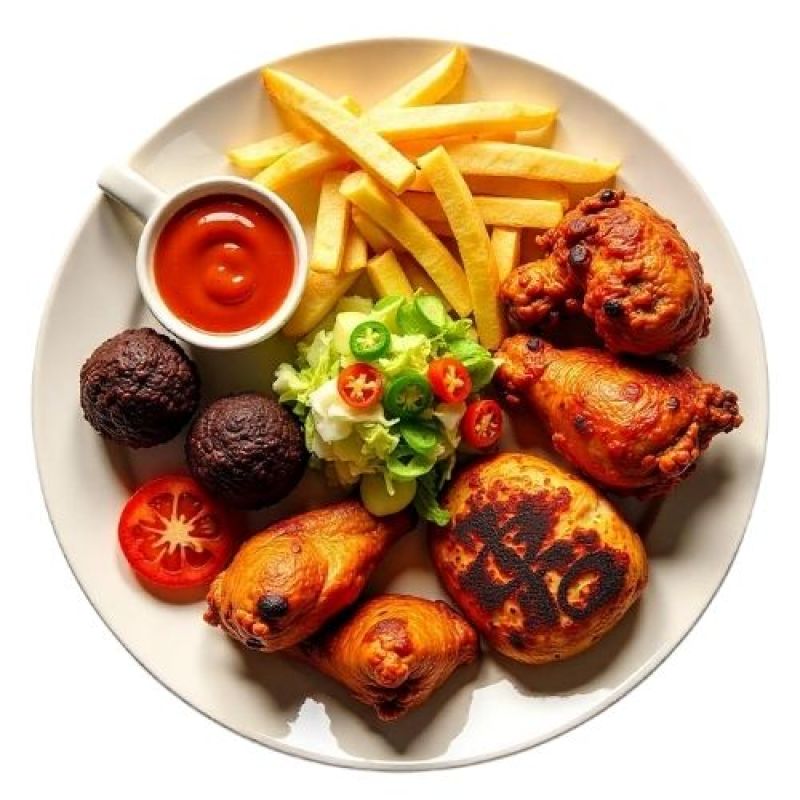 sla, ui, tomaat, witte kool, rode kool, olijven, rucola, balsamico, kip